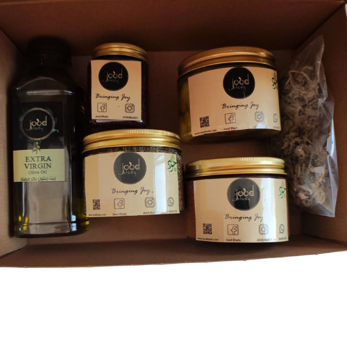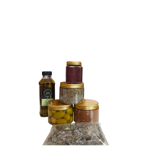 Box of Jordan food products essentials 500 ml Olive oil bottle 250 gm Green Olives 250 gm Zaatar Al Daffa 250 gm Dokka 100 gm Sumac Baladi